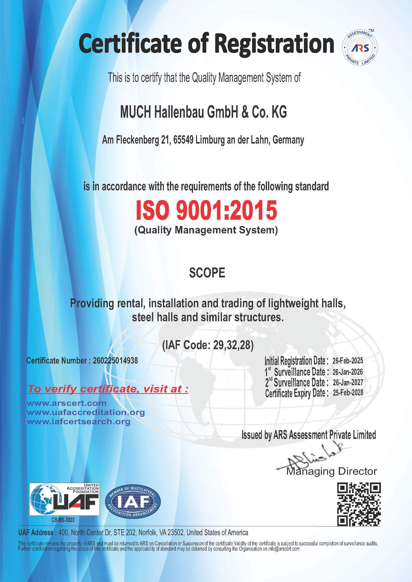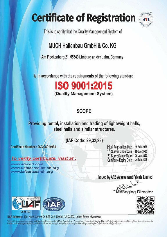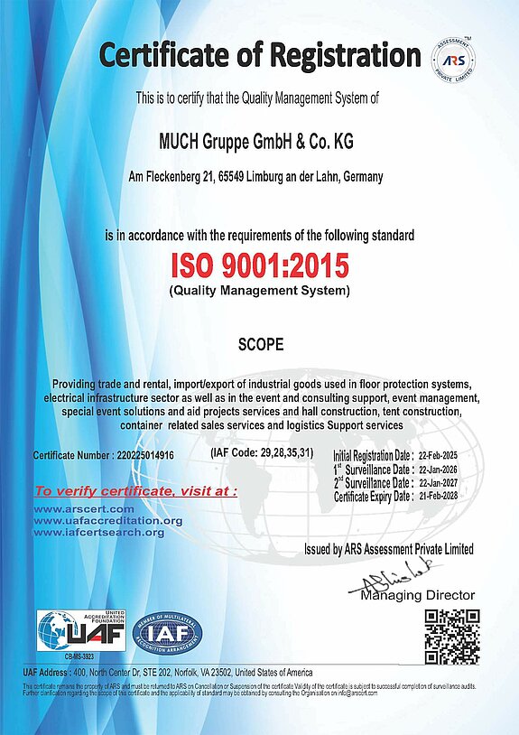 MUCH ist nach ISO 9001:2015 zertifiziert. Alle Leistungen unterliegen dokumentierten Prozessen, unsere Produkte erfüllen sämtliche militärischen und behördlichen Vorgaben. Wir bieten Planungs-, Liefer- und Rückbausicherheit – inklusive aller technischen Nachweise, Aufbauanleitungen und Prüfdokumente.