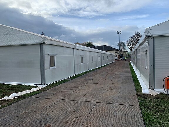 Unser Kombi-Paket für die Notunterkunft in Friedberg besteht aus einer Halle, Trennwänden für Privatsphäre, sanitären Anlagen, und Heizungen.