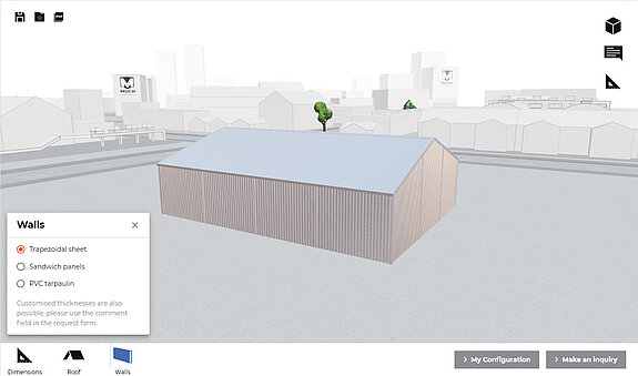 Customise your exterior walls with options such as trapezoidal sheets, sandwich panels, or PVC membranes. Individual wall thicknesses can also be specified.