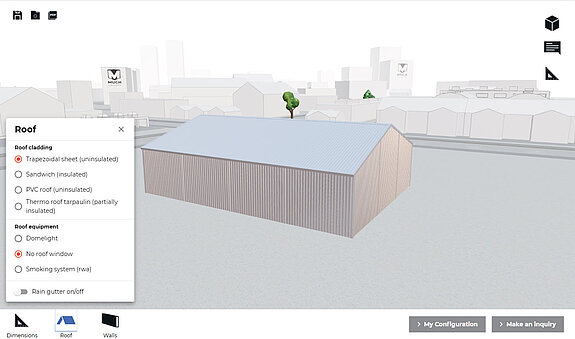Design your metal building exactly as you need it! Our 3D designer allows you to quickly and easily define the exact specifications for your building – from dimensions to customised features. You can effortlessly choose the shape, roof covering, and wall cladding. Start your project immediately without registration and create your perfect building in 3D with the MUCH Metal Building Designer.